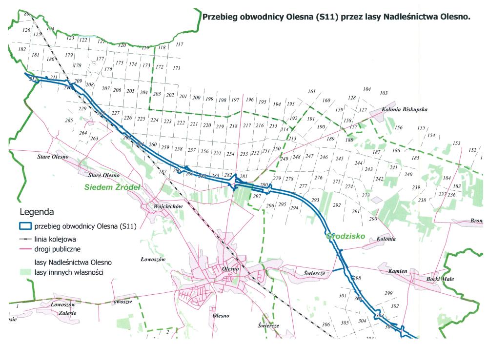 Obwodnica Olesna w ciągu drogi krajowej nr 11 (S11) o długości prawie 25 km, na odcinku ok. 10 km przebiegać będzie przez tereny Nadleśnictwa Olesno (leśnictwa Siedem Źródeł i Grodzisko), gdzie zajmie około 100 ha powierzchni.